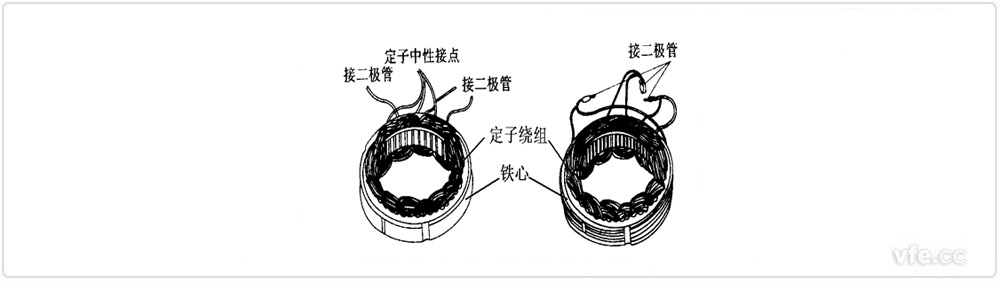 因為定子線圈中產(chǎn)生的電是交流電,它不能用于車輛上安裝的直流電器裝置,所以利用整流器將交流電變?yōu)橹绷麟姟?/p>