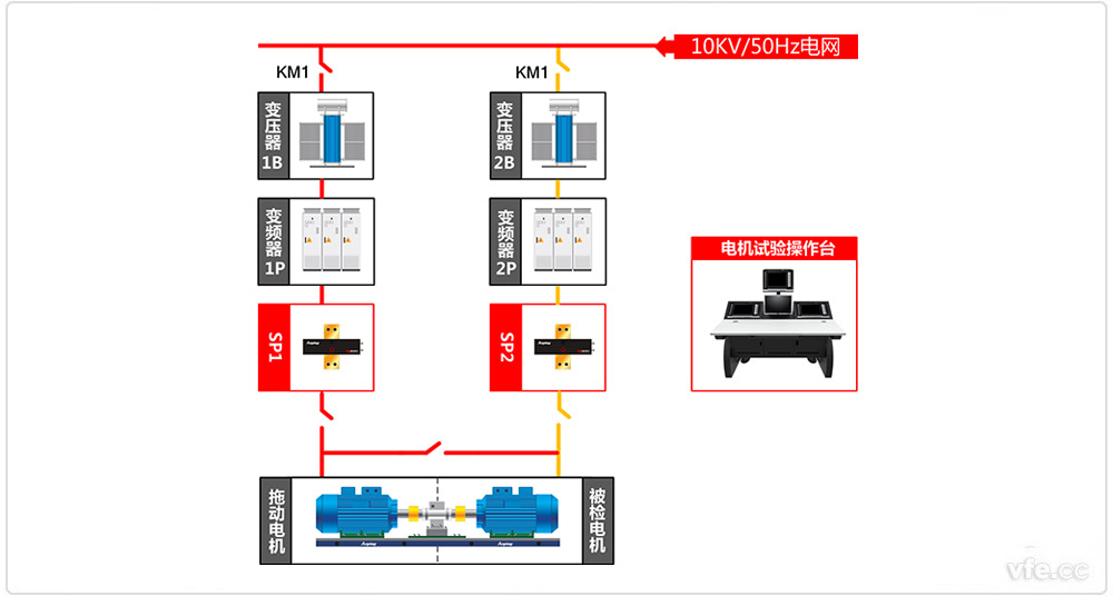 三相異步電動機容量5000kW及以下采用直接負載法進行負載溫升試驗。采用同型號、同規(guī)格兩臺電動機對拖方式進行。調(diào)節(jié)被試機供電變頻器2P輸出電壓及頻率,使其為額定電壓及額定頻率,調(diào)節(jié)拖動電機供電變頻器1P輸出電壓為拖動電機的額定電壓,調(diào)節(jié)拖動電機供電變頻器1P輸出頻率,使拖動電機處于異步發(fā)電狀態(tài),通過變頻器1P將試驗能量回饋至10kV電網(wǎng)。被試機和拖動側(cè)經(jīng)SP變頻功率傳器檢測電壓、電流、功率等電參量。由于本臺位被、陪試機側(cè)均有SP變頻傳器檢測,因而試驗可逆。無需改變?nèi)魏谓泳€,只改變調(diào)節(jié)方式即可將被試機變?yōu)榕阍嚈C,陪試機改為被試機。