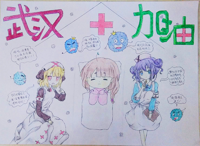 首先我先畫(huà)了一個(gè)醫(yī)院的標(biāo)識(shí),醫(yī)院的病床上有一個(gè)已經(jīng)被病毒感染了的小女孩,難受的躺在病床上,旁邊還有許許多多的病毒圍繞在她的旁邊。這次的病毒叫做新型冠狀病毒,它在顯微鏡下呈一種皇冠的形狀,所以就給它取了這么一個(gè)名字,并且它的身體上面布滿了密密麻麻的管狀東西,據(jù)說(shuō)它就是靠這種東西吸附在人們的體內(nèi)。同時(shí)為了照顧這個(gè)小女孩,我還在兩旁畫(huà)了兩個(gè)小護(hù)士,她們會(huì)幫助小女孩趕跑病毒。這也反映了在抗疫前線,醫(yī)護(hù)人員們不分晝夜地照顧病人,這體現(xiàn)了他們無(wú)私奉獻(xiàn)的精神。這幅畫(huà)的標(biāo)題是“武漢加油”,“加油”兩字上色用的是綠色,綠色是一種向人們展示它的旺盛生命力的顏色,而我也想用這種顏色來(lái)表達(dá)新型冠狀病毒很快便會(huì)被消滅的愿望。